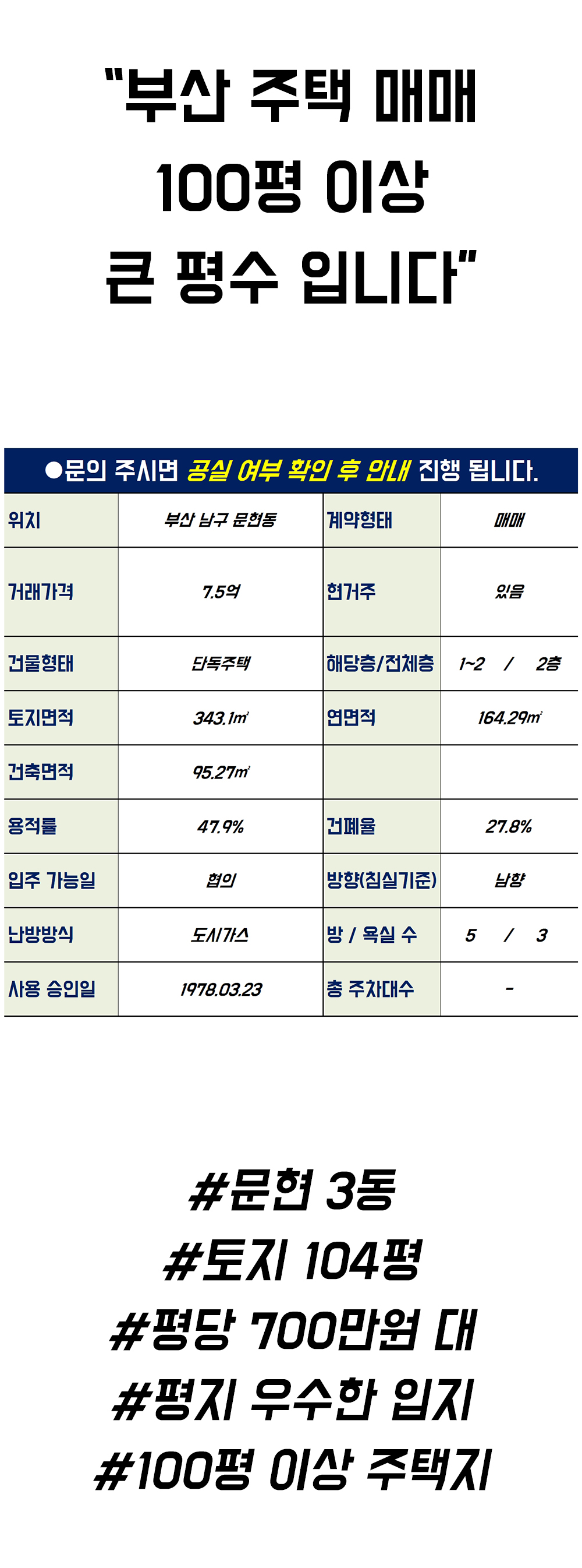 문현동 주택매매 가장 큰 특징은 대지가 100평이 넘는다는 것안돼. 부산 도심에서 100평이 넘는 땅을 가진 집을 찾기란 쉽지 않다. 하지만 가격은 평당 700만원대로 상당히 저렴하다.