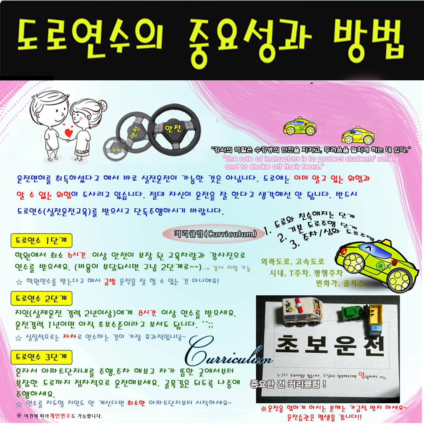 2) 일부 학원(교사)은 커리큘럼이 없습니다. 좋아요. 일정이다 함께 논의 직조가 더 효과적이기 때문입니다. 그런데 바람직하지 않은 유형의 강사가 있습니다. 유형 1은 너무 많은 보안을 강조합니다.하는 사람입니다. 운전자가 스스로 잘 운전할 수 있도록 안내를 받아야 하는데, 사고가 나지 않도록 교육하는 느낌이랄까요? 유형 2는 그 반대입니다.보지마. 너무 스파르타식입니다. 평범한 사람에게서 운전을 배우는 기분이 어떻습니까? (우호도 문제는 일단 배제)