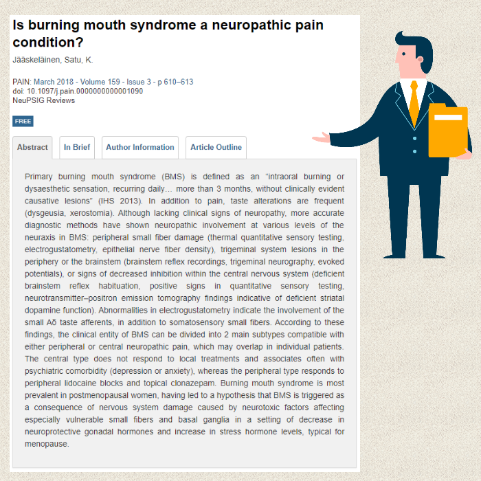 BMS를 포괄하는 것보다 넓은 의미의 통증에 Neuropathicorofacialpain(신경성 구강 안면 통증)이 있습니다. Neurotransmitter-positron emission tomography(PET)연구로 BMS도 중추 신경계의 도파민 이상이 관여하는 경우가 있음이 밝혀졌습니다.이것은 신경성 구강 안면 통증처럼 striatal dopaminergic top-down inhibition기능이 떨어진 결과입니다. PET의 결과 BMS환자인 도파민 수준은 일반인에 비하여 낮게 측정하는 경향이 있어 이는 파킨슨 병 초기 단계와 유사한 결과라는 연구도 있었습니다. 실제, 파킨슨 병 환자에게는 BMS가 일반인보다는 높은 비율로 발생하고 구강 내뿐만 아니라 다른 근육 관절의 통증 발생의 위험도 높아지는데, 그 원인의 하나가 도파민 부족이라는 의미입니다. 혀 통증에 대한 한방 치료